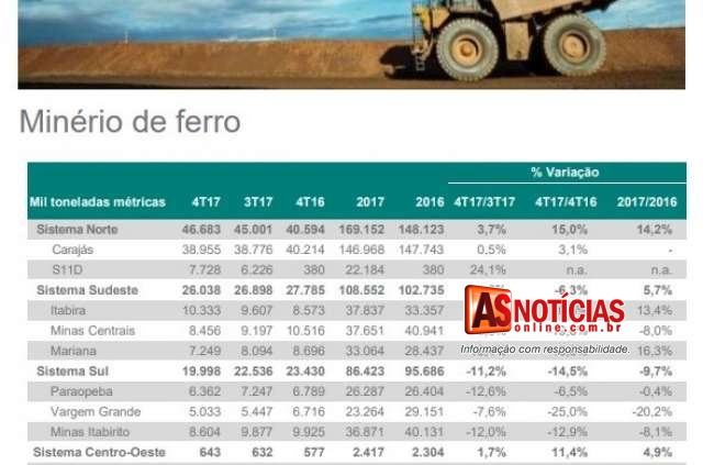 O Sistema Sudeste- que compreende os complexos de Itabira, Minas Centrais e Mariana, produziu 26,0 milhões de toneladas no quarto trimestre de 2017, ficando o volume 0,9 milhões de toneladas menor do que no terceiro trimestre de 2017, devido, principalmente, às ações da Vale para reduzir oferta de material de baixo teor e alta sílica, bem como à sazonalidade climática.