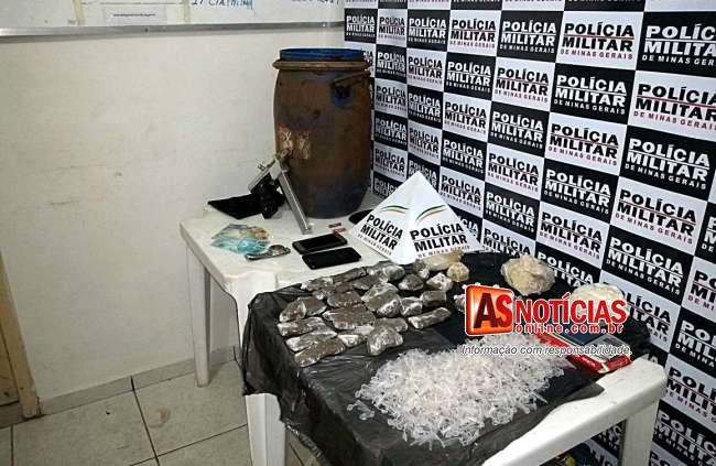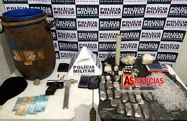 No segundo ponto em que os PMs foram levados foi desenterrado um tonel plástico na cor azul, contendo uma arma de fogo cromada de fabricação caseira calibre. 380, um carregador sem munições, um aparelho celular, cerca de R$ 150,00 reais, uma toca ninja, um relógio de pulso, diversos materiais usados para dolagem de entorpecente, aproximadamente 1000 pinos de embalagens de cocaína, 08 buchas de cocaína, uma pedra grande de cocaína, 27 tabletes de maconha, 5 pedras de crack prontas para comercio, uma pedra grande e uma media de crack.