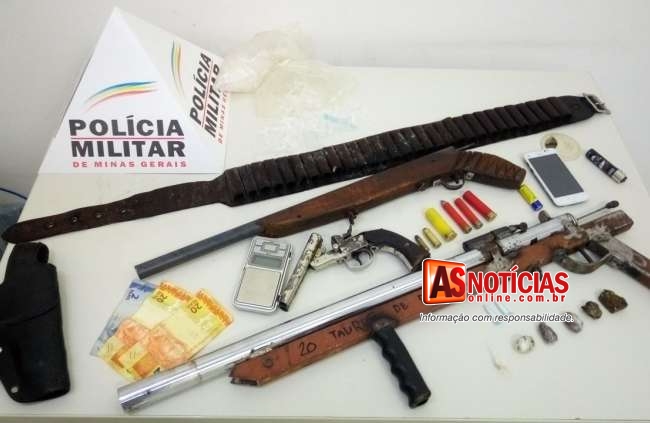 O material apreendido são duas armas de fabricação caseiras, calibres 20 e 28, uma garrucha calibre. 45, uma balança de precisão, cinco buchas de maconha, dois pinos de cocaína, um pacote contendo vários pinos vazios, um cartucho calibre 28, 2 cartuchos cal 36, uma munição cal 32, uma munição cal 44, um cinto porta munições e um coldre de arma.