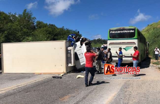 Após tombar na pista o caminhão se arrastou vindo a atingir o veículo de passageiros. Segundo a PRF somente o motorista do caminhão ficou ferido. Ele teve uma fratura na perna.