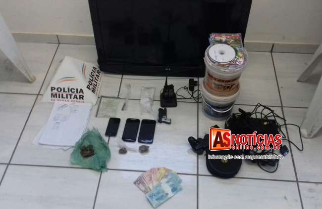 No interior da residência foi preso outro suspeito de 29 anos, que estava com um radio HT sintonizado na frequência da Policia Militar, foram localizados no interior desta residência os materiais, uma réplica de arma de fogo, três porções de maconha, dois pinos vazios usados para acondicionar cocaína, diversas saquinhos plásticos usados para embalar drogas, um cigarro de maconha, cerca de R$387,75 reais em dinheiro, um rádio comunicador monitorando a frequência da PM, um videogame, uma TV 32", três aparelhos celulares, um capacete, várias mídias de CD, os PMs encontraram ainda um caderno contendo anotações referentes ao tráfico de drogas, dois potes de doce, possivelmente provenientes de uma carga roubada na BR 381 dias atrás.