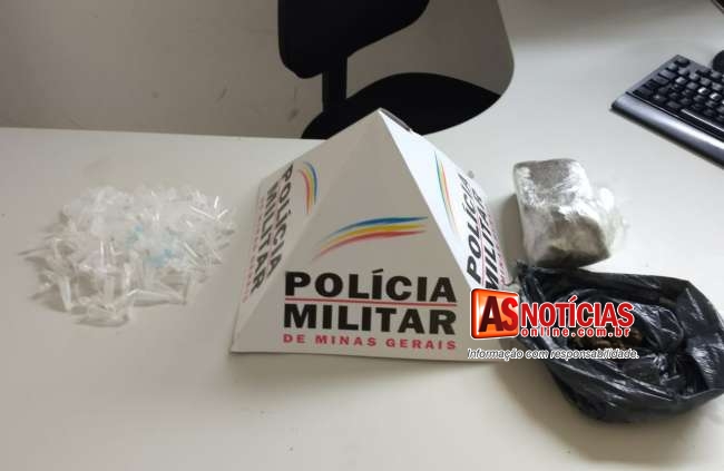 Com o suspeito já detido os Militares entraram na residência e durante as buscas foi encontrada a mochila, dentro dela encontrado uma barra de maconha e vários pinos vazios usados para acondicionar cocaína, no telhado da residência vizinha foi também encontrado uma sacola plástica com alguns pequenos tabletes de maconha que o suspeito também teria jogado.