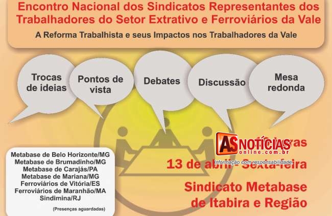 O Sindicato Metabase de Itabira e Região irá sediar o Encontro Nacional dos Sindicatos Representantes dos Trabalhadores do Setor Extrativo e Ferroviários da Vale. Com o tema principal “A Reforma Trabalhista e seus Impactos no Trabalhador da Vale”, o encontro tem como objetivo debater os prejuízos do trabalhador com a aplicação da lei 13.764/17 e as ações dos sindicatos diante deste prejuízo.
