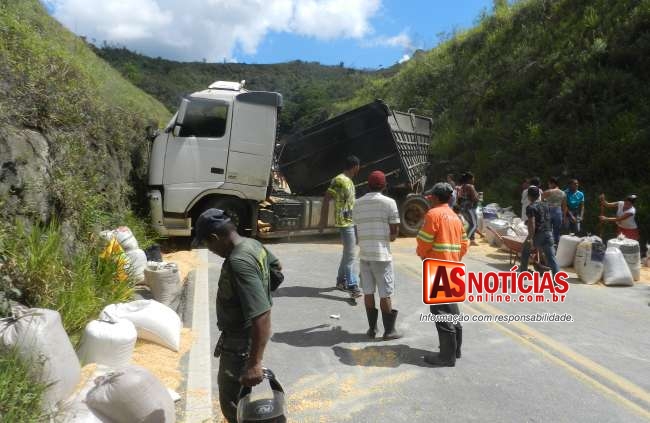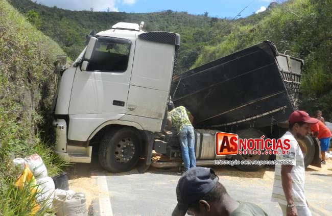 ITABIRA(MG)- Mais um acidente na MGC-120 estrada que liga Itabira a Nova Era, em Capoeirana, deixa rodovia completamente interditada nos dois sentidos da pista, uma carreta bi-trem carregada com cerca de 38 toneladas de milho, colidiu contra a ribanceira engavetando entre corte de rocha, não houve feridos.