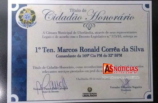 O 1º Tenente Marcos Ronald Corrêa, de 45 anos, conhecido em Itabira como “o sargento Ronald, que prendeu os autores de um latrocínio na cidade”, foi homenageado em Uberlândia, no estado de Minas Gerais.