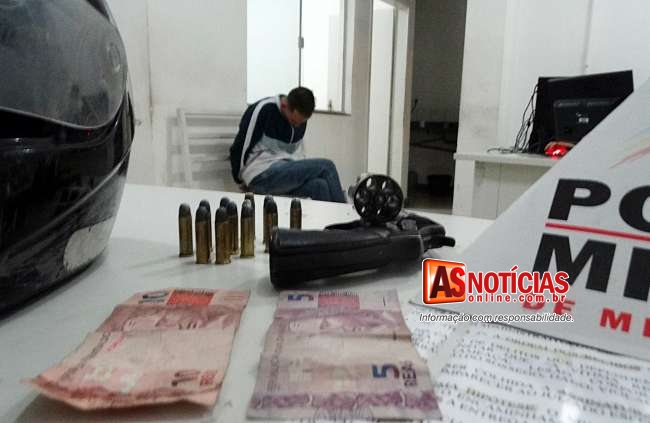 Segundo informações após repassar as características dos bandidos aos Militares esses em suas viaturas iniciaram um intenso rastreamento na região do fato, onde um Tático Móvel composto pelo Sargento Alvarenga, e os cabos João e Maik, avistado dois suspeitos em uma moto Honda XRE-300 de cor escura, em alta velocidade, no momento da abordagem a condutor da motocicleta conseguiu fugir, deixando para trás o garupa que ao perceber os PMs, tentou dispensar uma arma de fogo, que foi localizada e apreendida, sendo um revólver calibre. 38, com seis cartuchos intactos, em buscas feitas em seus pertences encontraram mais seis munições do mesmo calibre, também intactas.
