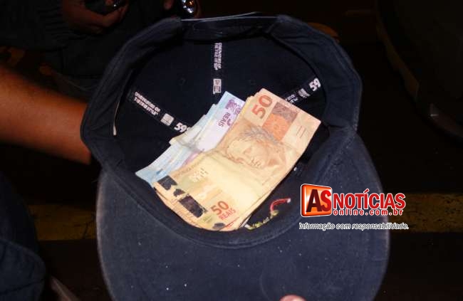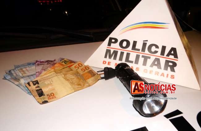 No mesmo instante em que a Central ainda comunicava com as viaturas do turno, o Tático Móvel II comandado pelo Sargento Nascimento, composto pelo Cabo Henrique e o Soldado Elizardo, que patrulhava nas proximidades do Santuário São Geraldo já tinha abordado o jovem Jeferson Rodrigo dos Santos, 21 anos, já conhecido pelos Militares pela pratica de furtos, em busca realizada no mesmo foi encontrado com o mesmo cerca de R$ 223,00 reais em dinheiro trocado, uma lanterna que o mesmo usou para simular estar armado.