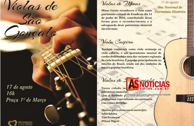 No município, a Secretaria Municipal de Cultura realiza a partir das 16h, na Praça 1° de Março, panfletagem sobre a importância da preservação do patrimônio histórico e o encontro Violas de São Gonçalo, momento que reúne os músicos são-gonçalenses Adão Sabaru, Tião Promessa e Wilson Tupete.