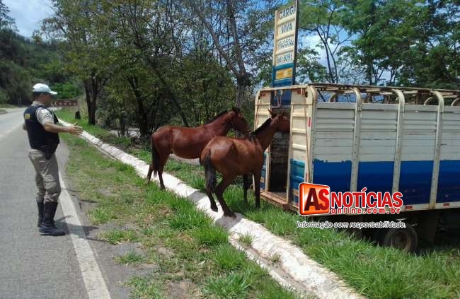 Na rodovia AMG-900, no km 6 próximo de um trevo no bairro Conceição foram apreendidos dois animais equinos, sendo uma égua e um potro, eles estavam soltos as margens da rodovia colocando em risco os usuários da via.