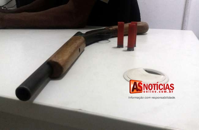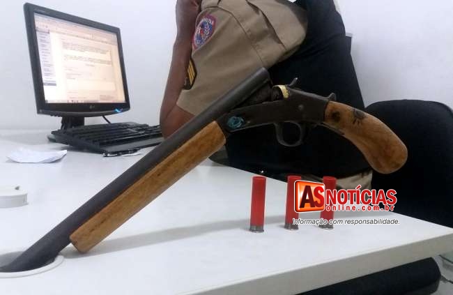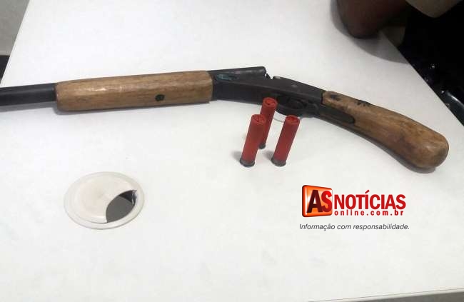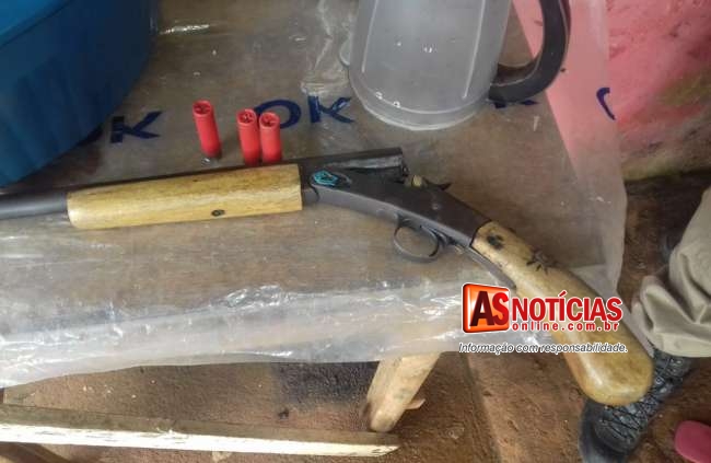 De imediato as viaturas foram ao local, onde com autorização de familiares entraram na residência onde o suspeito estava em buscas feitas conseguiram encontrar escondida atrás de um guarda roupa uma garrucha calibre 28 de um cano, e três cartuchos intactos do mesmo calibre.