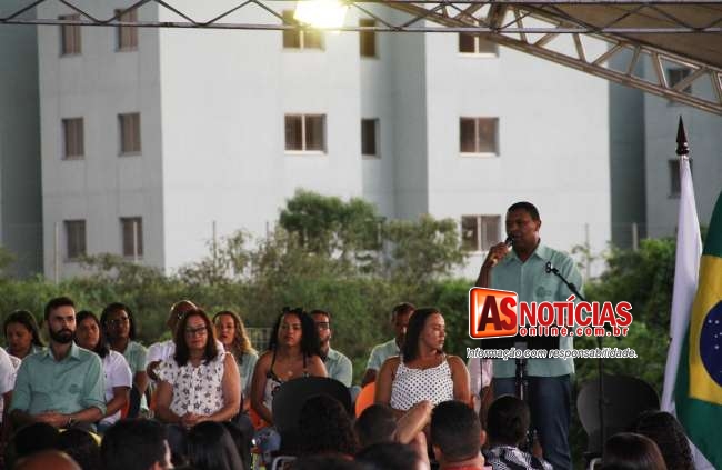 Apresentando uma cronologia de execução do programa, o Chefe do Executivo potencializou “o desafio do trabalho para que pudéssemos realizar esse momento com vocês”. Segundo ele, 850 pessoas residirão no local, ocasião em que citou também a beneficiária Leila Soares, primeira inscrita do Programa. Chamando-a ao palco para parabenizar e agradecê-la, o Prefeito surpreende o vice-prefeito Alcemir e a secretária de Desenvolvimento Social, Habitação e Emprego, Ordália, quando dedica, à nova moradora, dois presentes de singular importância, que havia ganhado deles, em anos anteriores.